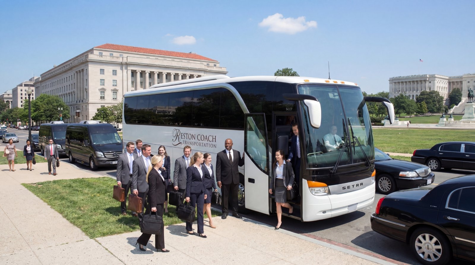 Whether you need to book for a small 10-14 passenger transport van, for group airport transfers or a larger mini coach 20-40 passenger shuttle bus or a luxury Executive mini-coach bus, a deluxe 50-57 passenger motorcoach / Charter bus equipped with full size toilet for out of town trips; Reston Coach Bus Company got it all. No matter what type of event you may have, we have a perfect size buses for your entire team at the lowest rate possible. Whether you are looking to book a one-time shuttle bus or a long term bus contract for your company in Northern VA / DC metro area; Reston Coach Bus Company can assist you to pick a right vehicle to fit your needs and to meet your limited budget.!